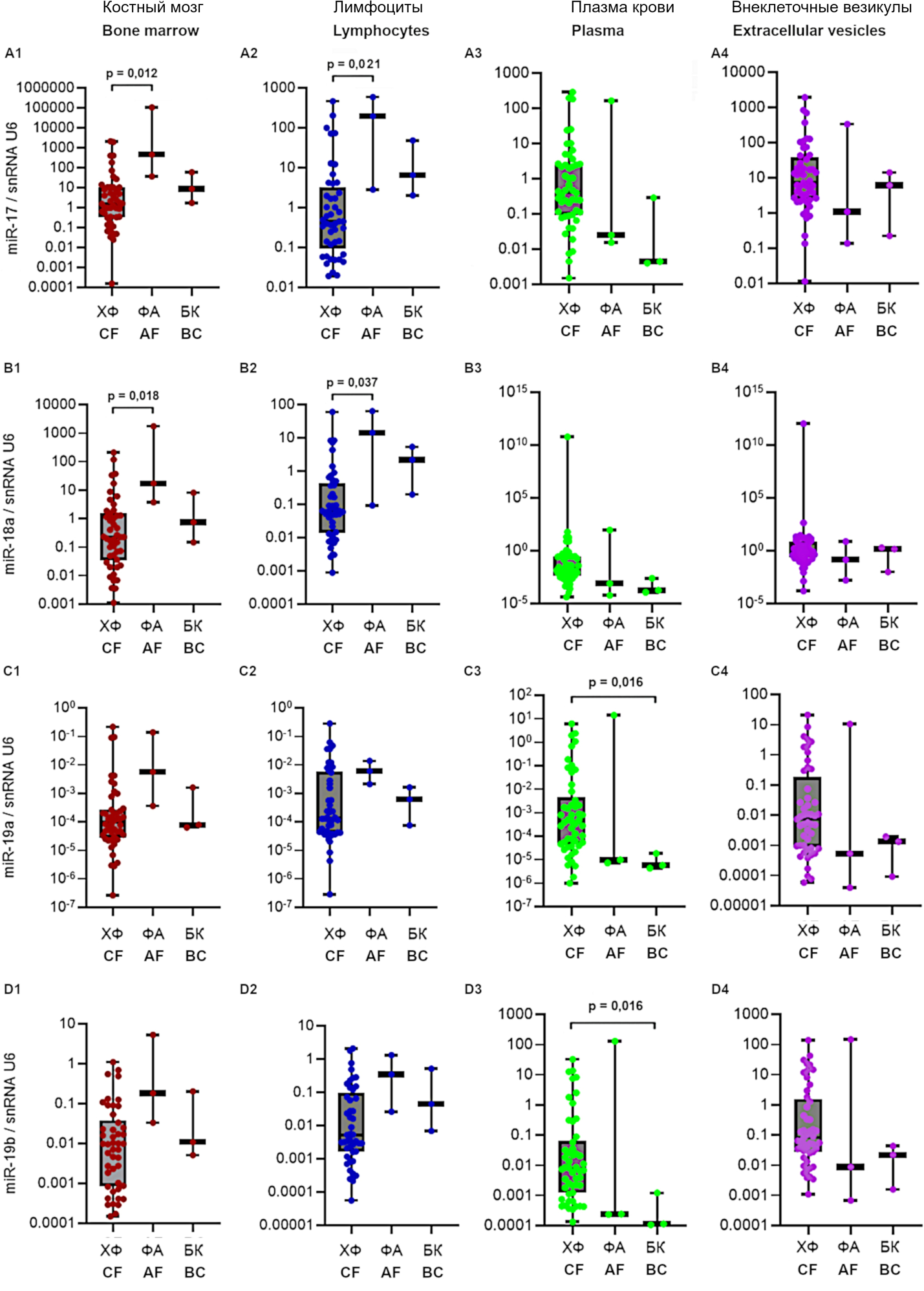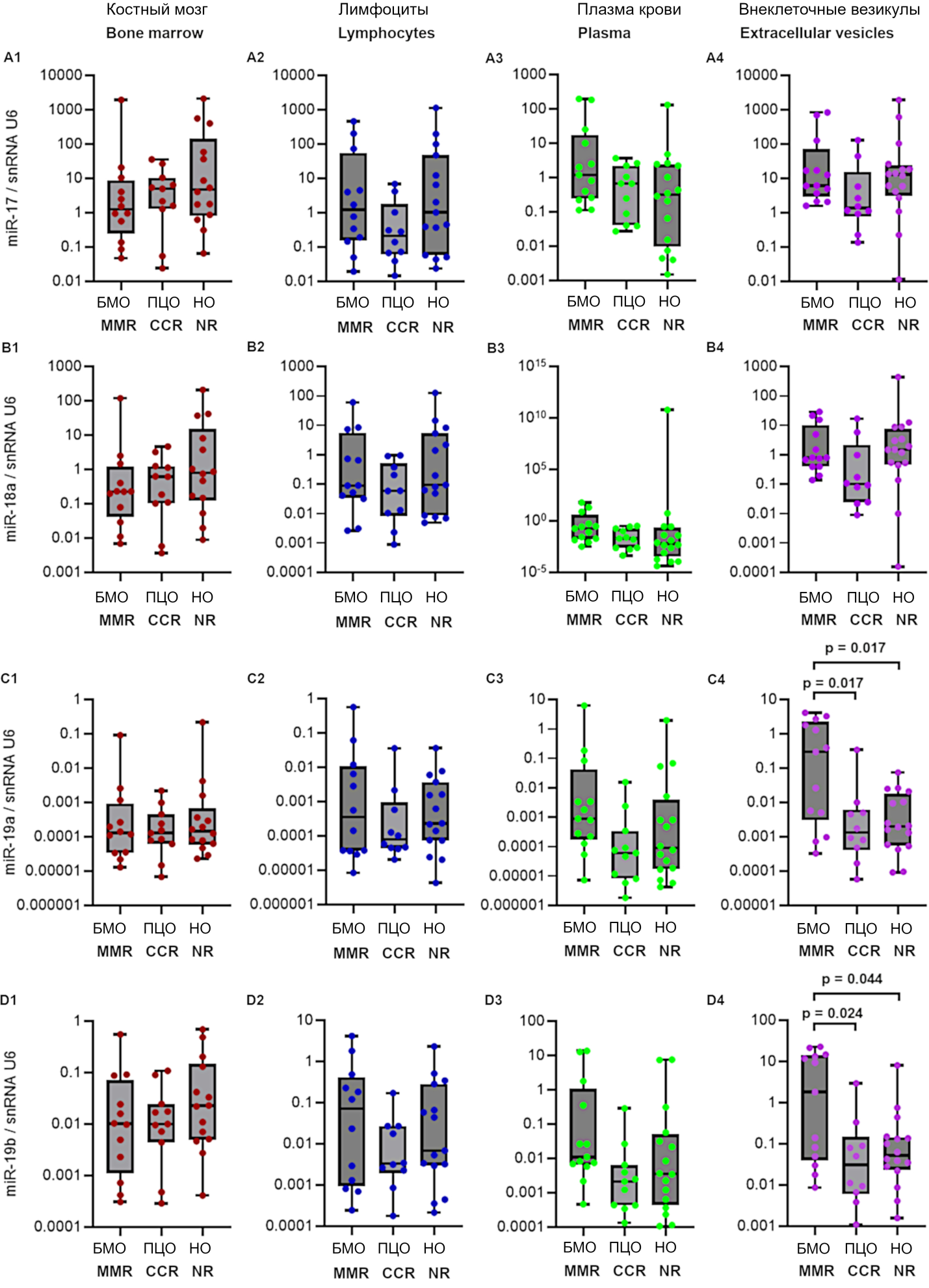 Результаты. В костном мозге и лимфоцитах крови уровень экспрессии miR-17, miR-18а и miR-20a оказался выше у пациентов в фазе акселерации (ФА) по сравнению с хронической фазой (ХФ), а также у больных с неблагоприятным прогнозом. Уровень экспрессии miR-19a и miR-19b в плазме был выше у пациентов с ХФ по сравнению с бластным кризом (БК) и у пациентов с благоприятным прогнозом. Уровень экспрессии miR-19а был выше у пациентов с благоприятным прогнозом в микровезикулах, а уровень экспрессии miR-203 был выше у пациентов с благоприятным прогнозом в микровезикулах и плазме крови. Также экспрессия miR-203 оказалась существенно выше в микровезикулах у пациентов, достигших большого молекулярного ответа (БМО).