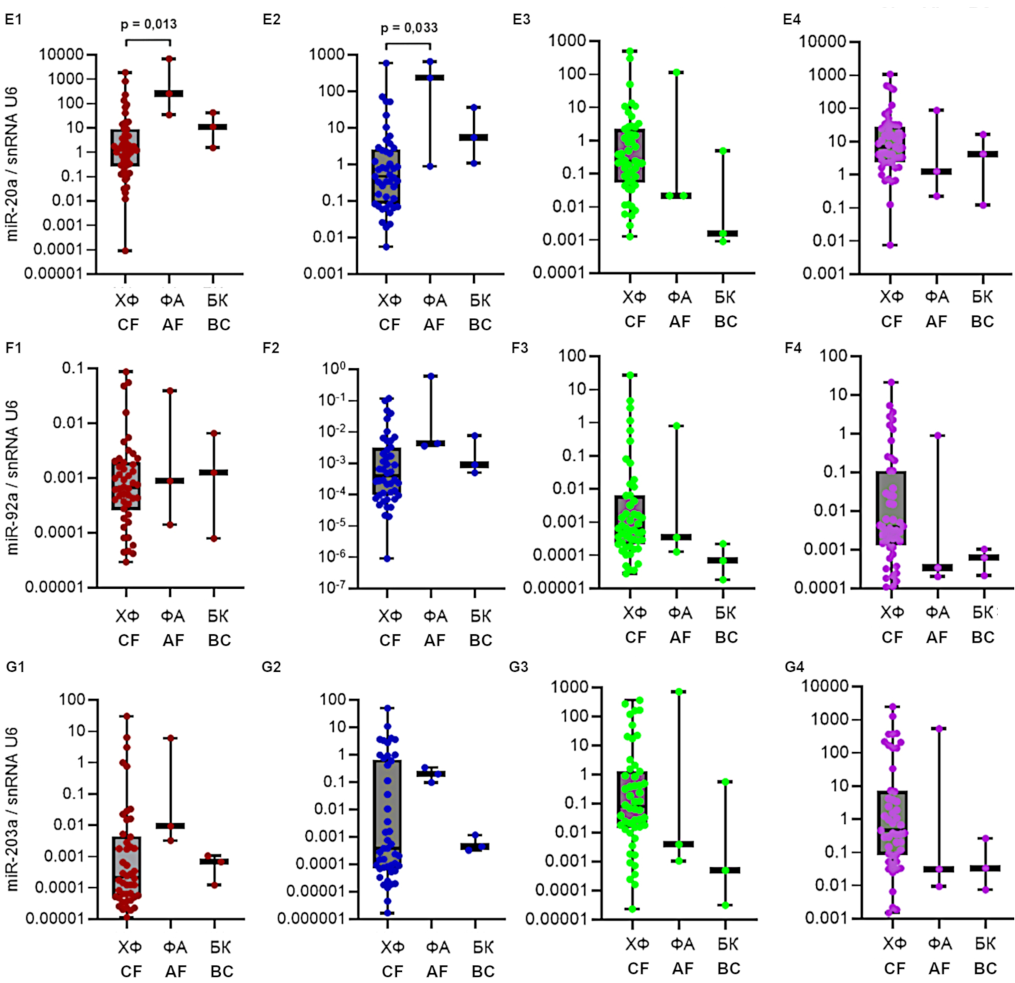 Заключение. Наиболее перспективными в плане возможного практического применения представляются miR-17, miR-18а и miR-20a в костном мозге и лимфоцитах, miR-19a и miR-19b в плазме крови, а также miR-203 в плазме крови и в микровезикулах.