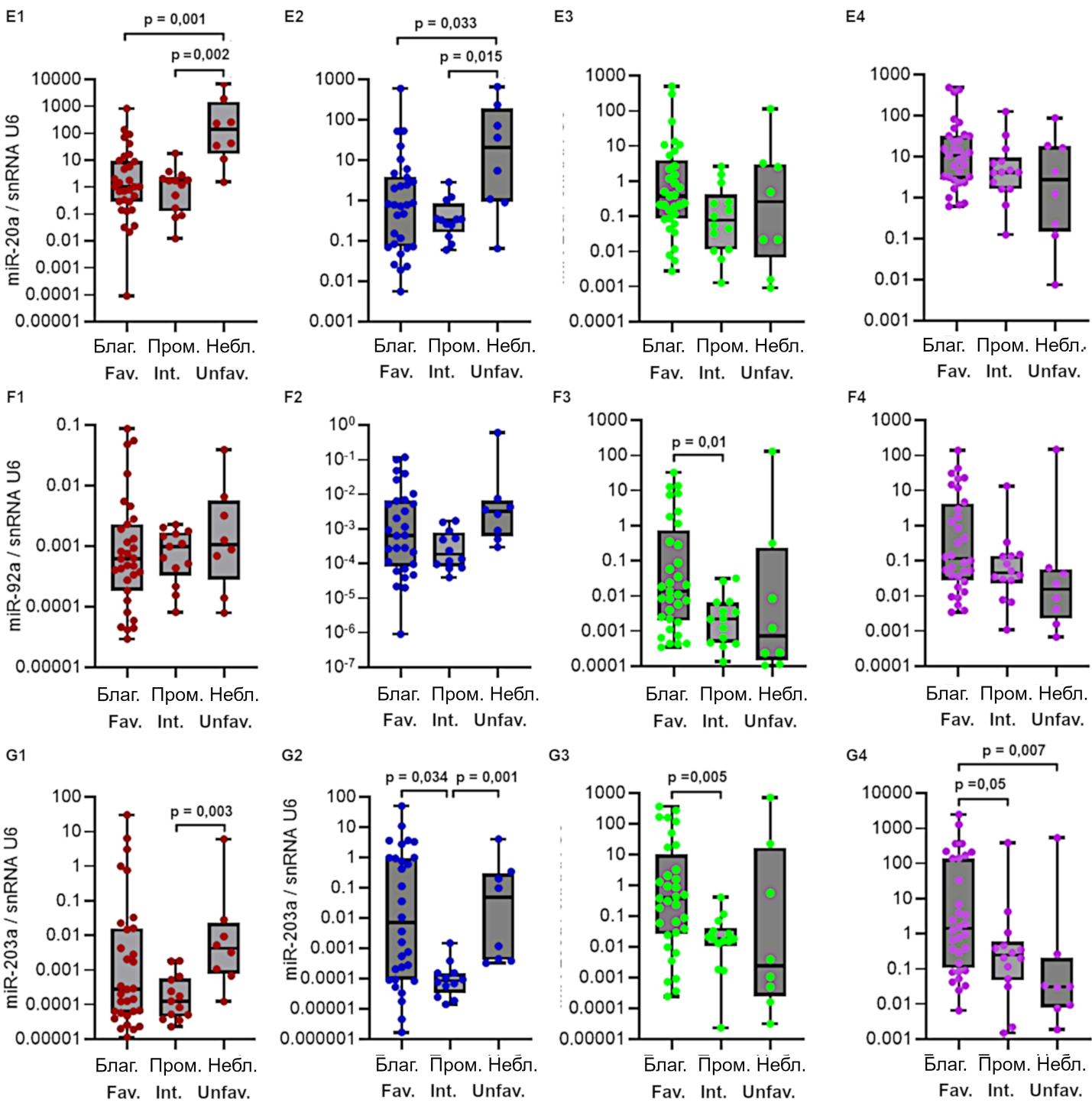 3. Рис. 2. Уровень экспрессии miR-17-92 (А-F) и miR-203а (G) в костном мозге и лимфоцитах периферической крови в группах пациентов с различным прогнозом заболевания. Данные представлены в виде медианы и 25–75 процентилей, минимального и максимального значений относительного уровня экспрессии. Благоприятный прогноз (благ.) – n=27–33, промежуточный прогноз (пром.) – n=12–15, неблагоприятный прогноз (небл.) – n=8; рисунок выполнен авторами