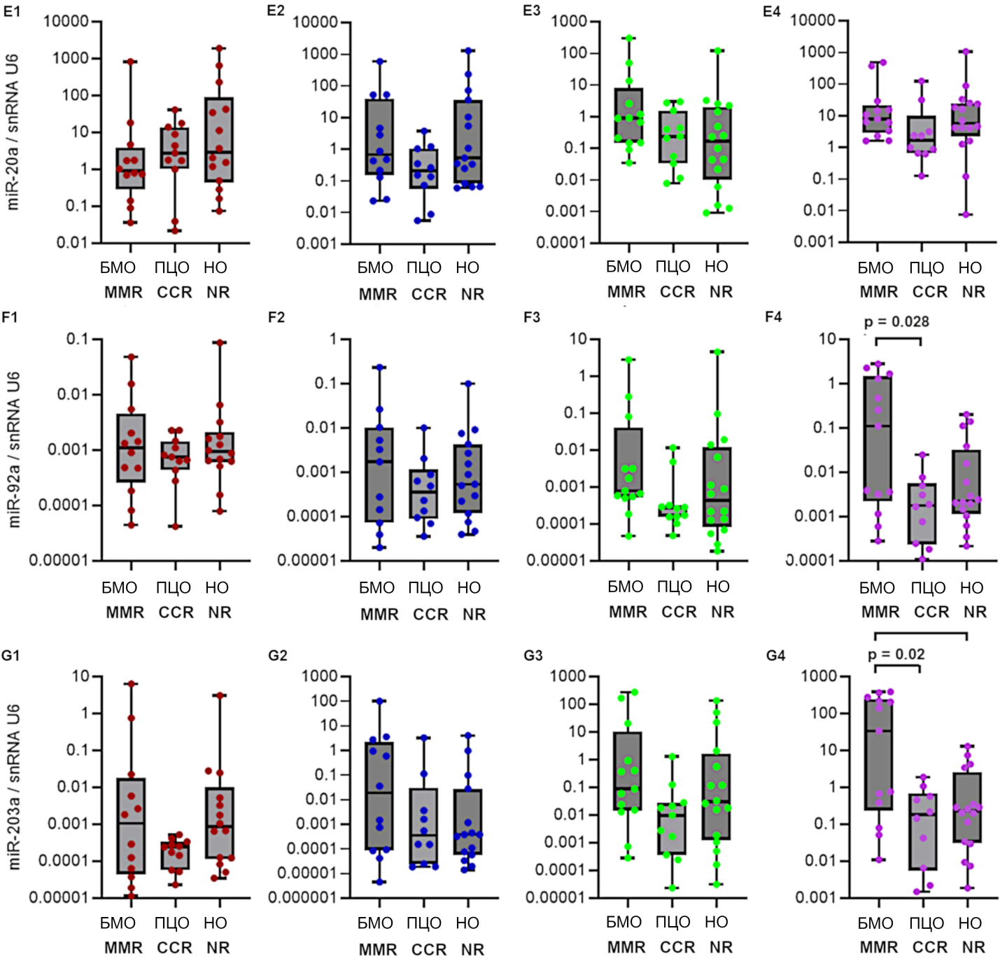 5. Рис. 3. Уровень экспрессии miR-17-92 (А-F) и miR-203а (G) в костном мозге и лимфоцитах периферической крови в группах пациентов с разным ответом на терапию. Данные представлены в виде медианы и 25–75 процентилей, минимального и максимального значений относительного уровня экспрессии. Большой молекулярный ответ (MMR) – n=12–13, полный цитогенетический ответ (CCR) – n=10–11, нет ответа – n=14–16; рисунок выполнен авторами