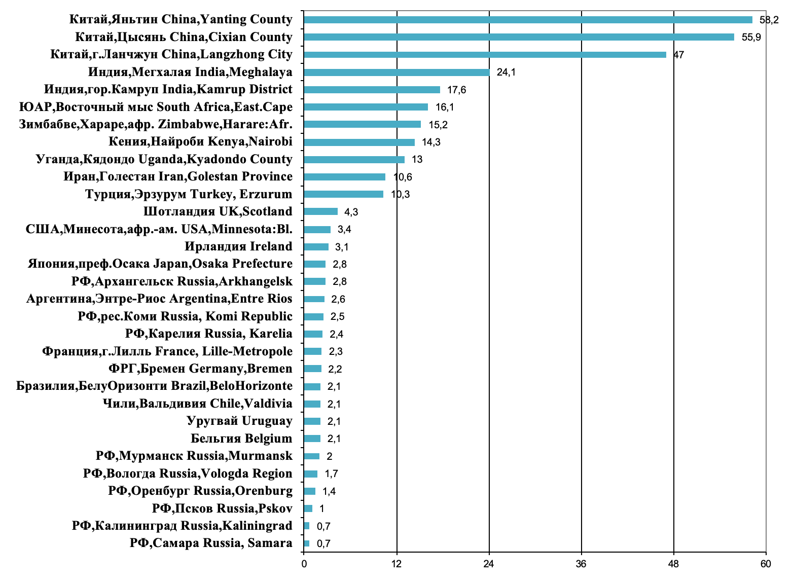 1. Рис. 1. Регионы мира с наибольшей заболеваемостью раком пищевода у мужчин (стандартизованные по возрасту показатели на 100 000 населения, по данным из Cancer Incidence in Five Continents, Vol. XII, 2023) [2]
