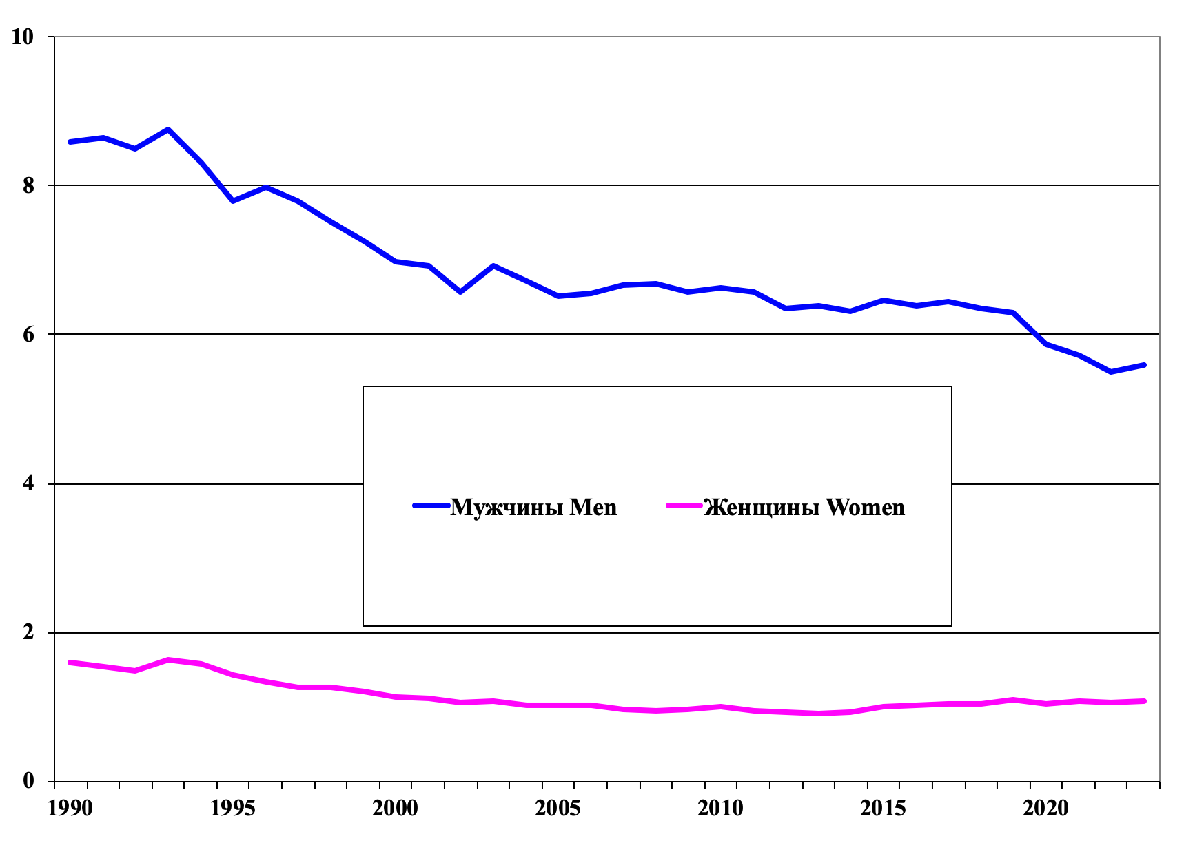 5. Рис. 5. Динамика заболеваемости раком пищевода в России (стандартизованные по возрасту показатели на 100 000 населения, по данным Национального канцер-регистра МНИОИ им. П.А. Герцена). Примечание: рисунок выполнен автором