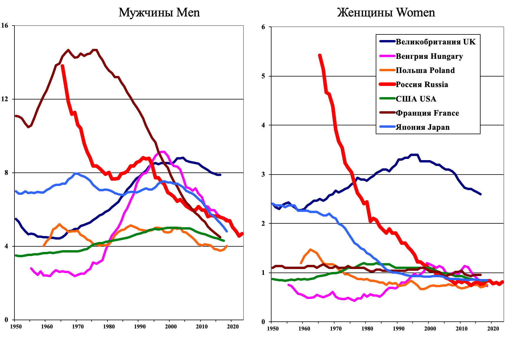 6. Рис. 6. Динамика смертности от рака пищевода в некоторых странах (стандартизованные по возрасту показатели на 100 000 населения, по данным из GLOBOCAN 2022, IARC) [1]