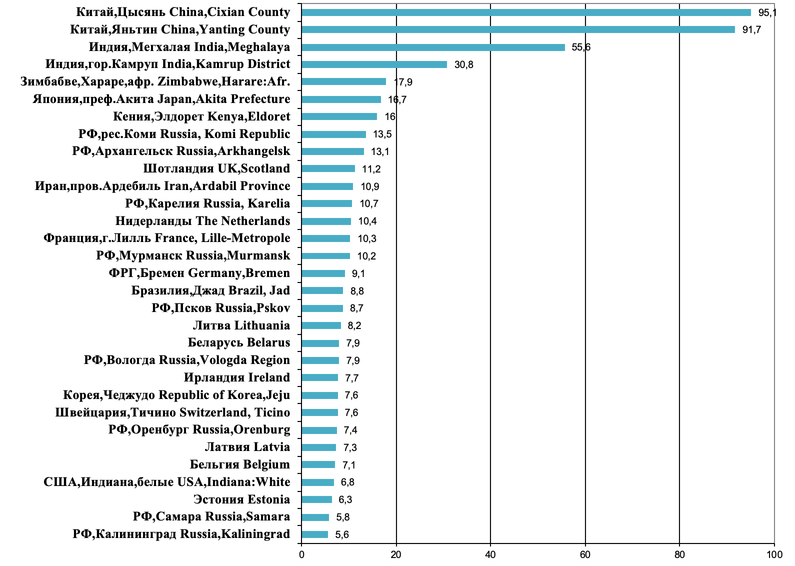 1. Рис. 1. Регионы мира с наибольшей заболеваемостью раком пищевода у мужчин (стандартизованные по возрасту показатели на 100 000 населения, по данным из Cancer Incidence in Five Continents, Vol. XII, 2023) [2]