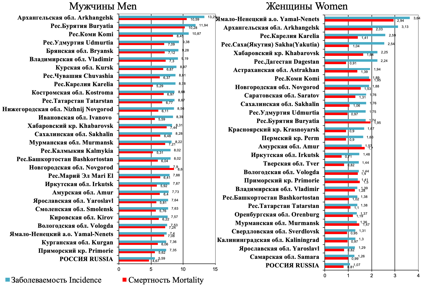 4. Рис. 4. Регионы России с наибольшей заболеваемостью раком пищевода в 2023 г. (стандартизованные по возрасту показатели на 100 000 населения, по данным из: Каприн А.Д. с соавт., 2024 г.) [7]