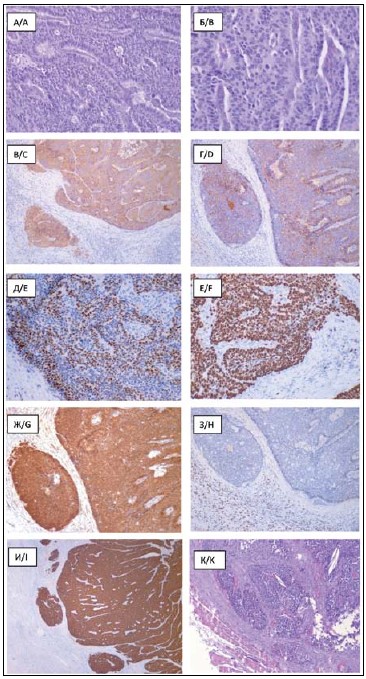 1. Рис. 1. Микрофото. Крупноклеточная нейроэндокринная карцинома шейки матки. А. Опухоль образована из трабекулярных и папиллярных структур, ×250. Б. При большем увеличении видны митотические фигуры и апоптозные тельца, ×400. Положительная реакция клеток опухоли с общими маркерами нейроэндокринной дифференцировки: с синаптофизином (В), хромогранином А (Г) и INSM-1 (Д), ×125, ×250, × 250 соответственно. Е. Высокая пролиферативная активность клеток опухоли, индекс Ki67 равен 73,5 %, ×250. Ж. Интенсивная цитоплазматическая экспрессия р16 в клетках опухоли, ×250. З. Экспрессия рецепторов к прогестерону в строме шейки матки, но не в клетках опухоли, × 250. И. Интенсивная экспрессия цитокератина 7 в клетках опухоли, ×125. К. Метастаз КК НЭК шейки матки в мышцу, ×40. А, Б, К – окраска гематоксилином и эозином. В–И – ИГХ-реакция. Примечание: рисунок выполнен авторами