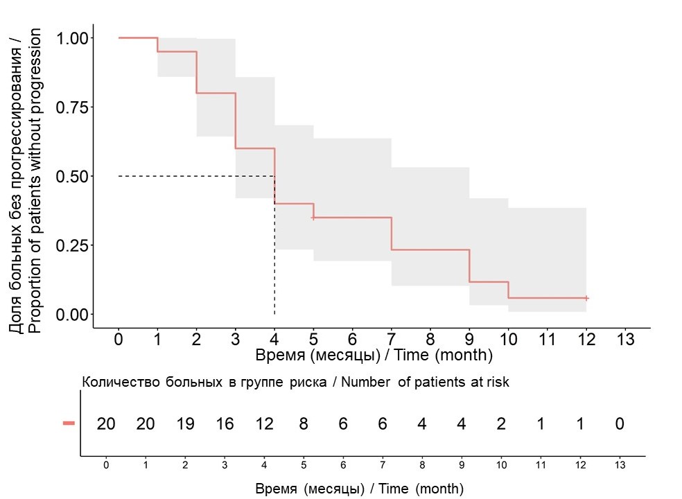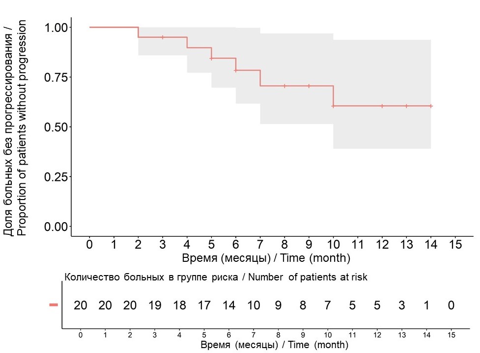 Заключение. Полученные показатели ВБП позволяют предположить, что даже в прогностически крайне неблагоприятной группе больных комбинация СТЛТ и ИКТИ в ряде случаев позволяет достигнуть ответа на терапию.