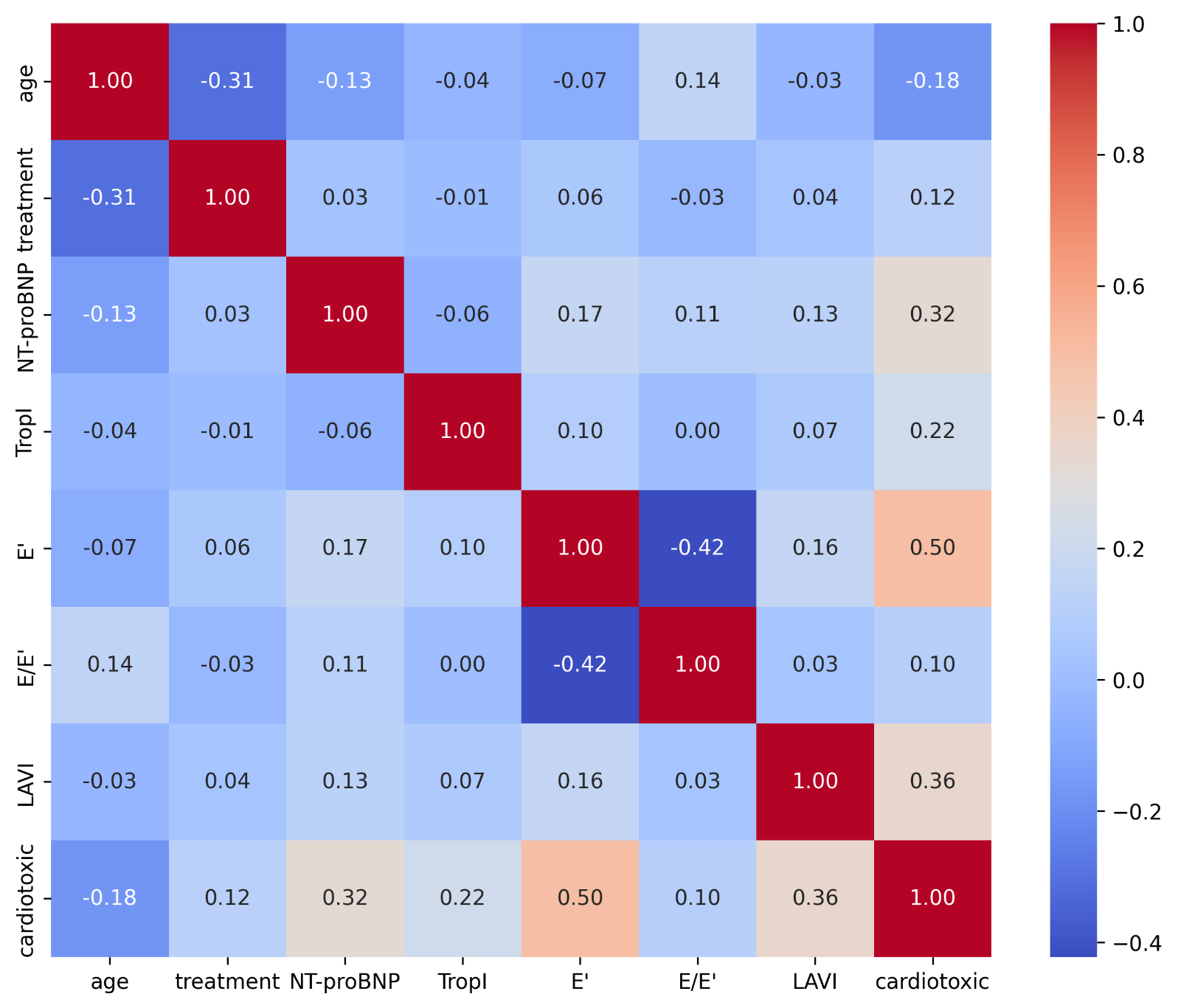 1. Рис. 1. Тепловая карта коэффициентов корреляции Пирсона между исследуемыми клинико-лабораторными, эхокардиографическими параметрами и развитием антрациклин-индуцированной кардиотоксичности. Примечание: рисунок выполнен авторами | |