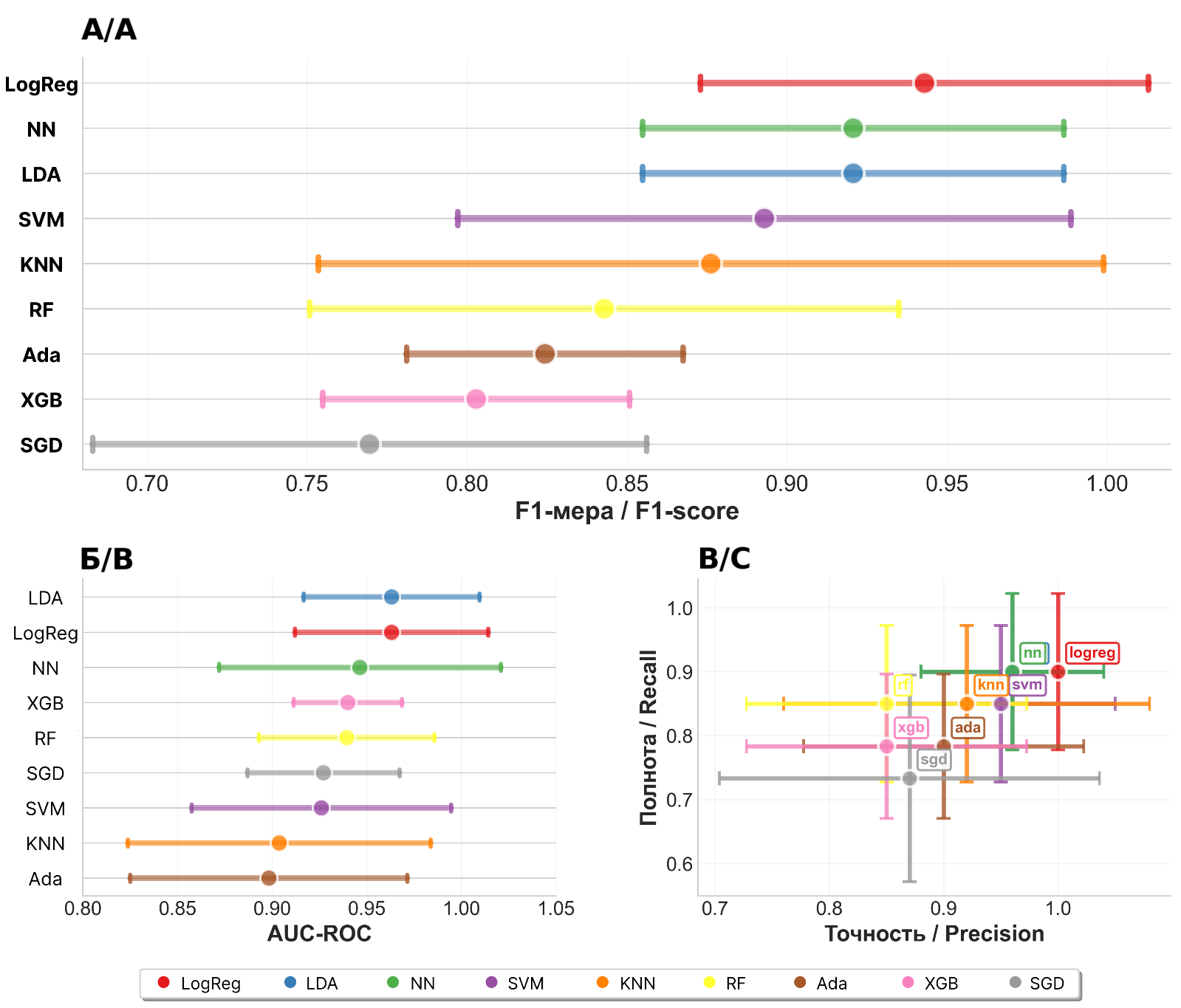 3. Рис. 3. Комплексный анализ производительности алгоритмов машинного обучения для прогнозирования АИК. Комбинированная диаграмма демонстрирует сравнительную оценку девяти алгоритмов машинного обучения: логистическая регрессия (LogReg), линейный дискриминантный анализ (LDA), метод опорных векторов (SVM), k-ближайших соседей (KNN), случайный лес (RF), адаптивный бустинг (Ada), градиентный бустинг (XGB), стохастический градиентный спуск (SGD) и нейронная сеть (NN). A – сравнение F1-меры; Б – производительность по метрике AUC-ROC; В – диаграмма рассеяния «точность против полноты». Все доверительные интервалы рассчитаны на основе стандартных отклонений, полученных при кросс-валидации. Примечание: рисунок выполнен авторами | |