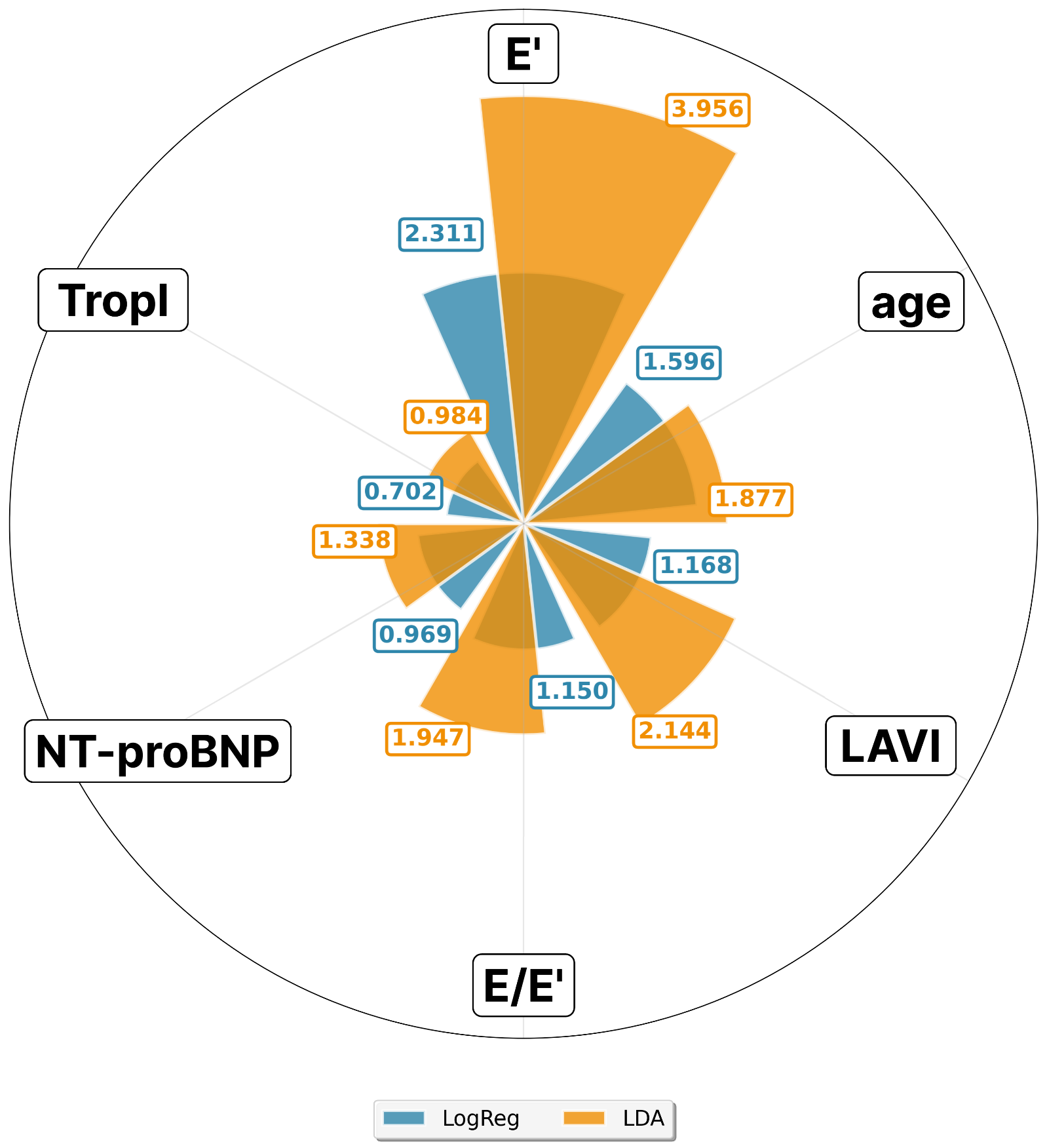 4. Рис. 4. Сравнение важности прогностических маркеров в моделях логистической регрессии (LogReg) и линейного дискриминантного анализа (LDA). Примечание: рисунок выполнен авторами | |