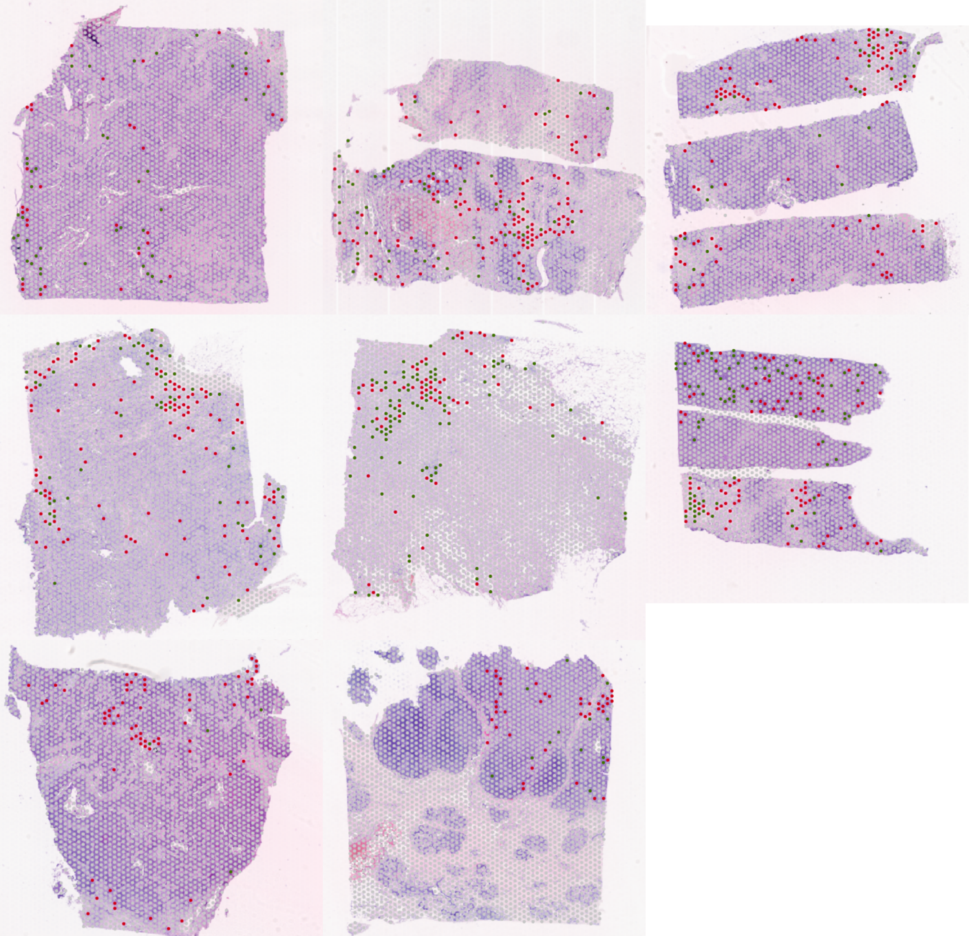 1. Рис. 1. Аннотация спотов в Loupe Browser (зеленые точки – стромальные CD68+ споты; красные точки – стромальные CD163+ споты). Примечание: рисунок выполнен авторами | |