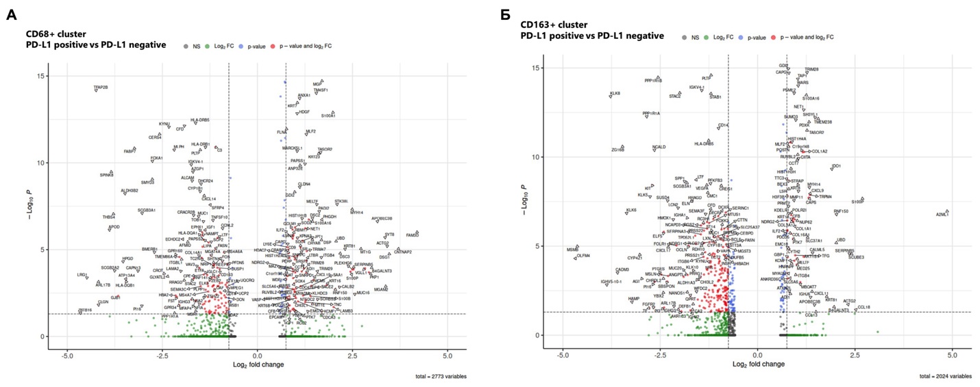 2. Рис. 2. Диаграмма рассеяния (volcano plot), иллюстрирующая результаты анализа дифференциальной экспрессии генов в кластере CD68+ клеток (А) и CD163+ кластере (Б) стромы опухоли у пациенток с положительным и отрицательным PD-L1 статусом. Примечание: рисунок выполнен авторами | |