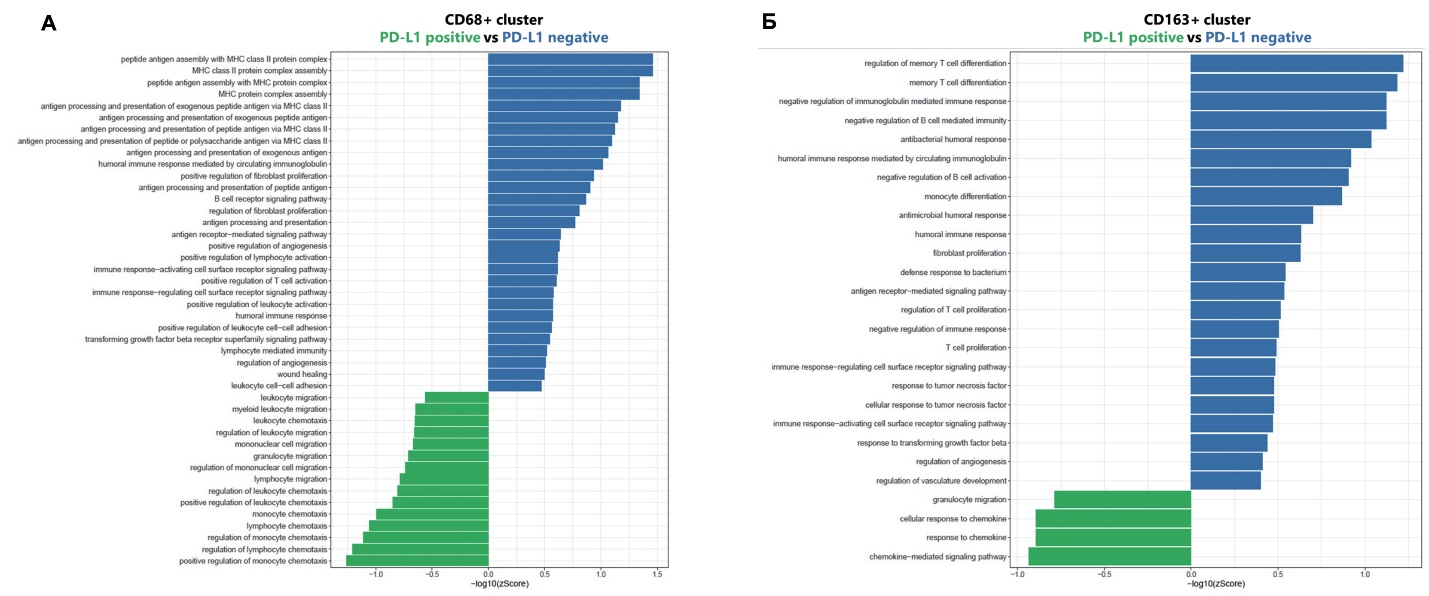 3. Рис. 3. Обогащенные биологические процессы в CD68+ кластере (А) и в CD163+ кластере (Б) в зависимости от PD-L1 статуса (зеленым цветом показаны процессы, обогащенные у пациенток с позитивным PD-L1 статусом, синим – у пациенток с негативным PD-L1 статусом). Примечание: рисунок выполнен авторами | |
