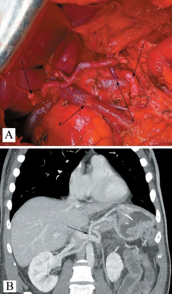 2. Рис. 2. A. TП с ПВР: 1 – культя общего желчного протока; 2 – верхняя брыжеечная артерия; 3 – анастомоз левой желудочной и левой почечной вен; 4 – портомезентериальный анастомоз. Б. КТ скан того же пациента на 7-е сут после операции. Стрелка указывает на хорошо функционирующий венозный анастомоз. Примечание: рисунок выполнен авторами | |