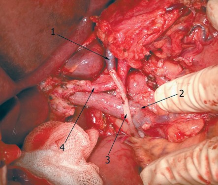 3. Рис. 3. TП с ПВР: 1 – левая желудочная вена; 2 – портомезентериальный анастомоз; 3 – правая гонадная вена; 4 – печеночная артерия. Примечание: рисунок выполнен авторами | |