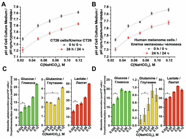 1. Рис. 1. Влияние гидрокарбоната натрия на pH культуральной среды и клеточный метаболизм в клетках CT26 и меланомы. Изменения pH культуральной среды для клеток CT26 (A) и меланомы (B), измеренные сразу (0 ч) и после 24 ч инкубации с различными концентрациями гидрокарбоната натрия (C, D). Количественная оценка потребления глюкозы и глутамина, а также секреции лактата (мкмоль/106 клеток) в клетках CT26 (C) и меланомы (D) после 24-часового воздействия различных концентраций гидрокарбоната натрия. Примечания: данные представлены как среднее значение ± стандартное отклонение; * – различия значимы по сравнению с соответствующей контрольной группой (p<0,01); рисунок выполнен авторами | |