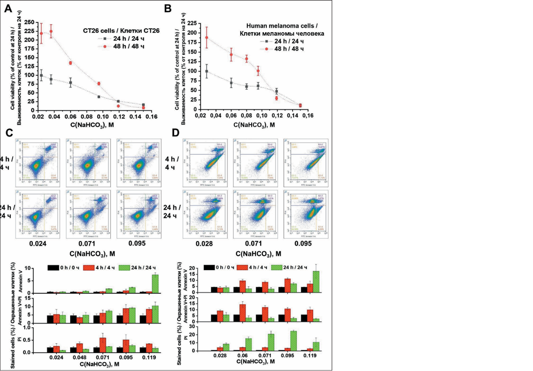 2. Рис. 2. Влияние гидрокарбоната натрия на жизнеспособность клеток и апоптоз в клетках CT26 и меланомы. Жизнеспособность клеток CT26 (A) и меланомы (B) после обработки различными концентрациями гидрокарбоната натрия, оцененная методом проточной цитометрии (Контрольная группа – клетки в немодифицированной среде через 24 ч). Анализ маркеров апоптоза методом проточной цитометрии в клетках CT26 (C) и меланомы (D) с использованием окрашивания аннексином V в отдельности и в комбинации с йодидом пропидия (аннексин V/PI) (контрольная группа – клетки в немодифицированной среде на 0 ч). Примечания: данные представлены как среднее значение ± стандартное отклонение; * – различия значимы по сравнению с соответствующей контрольной группой (p<0,01); рисунок выполнен авторами | |