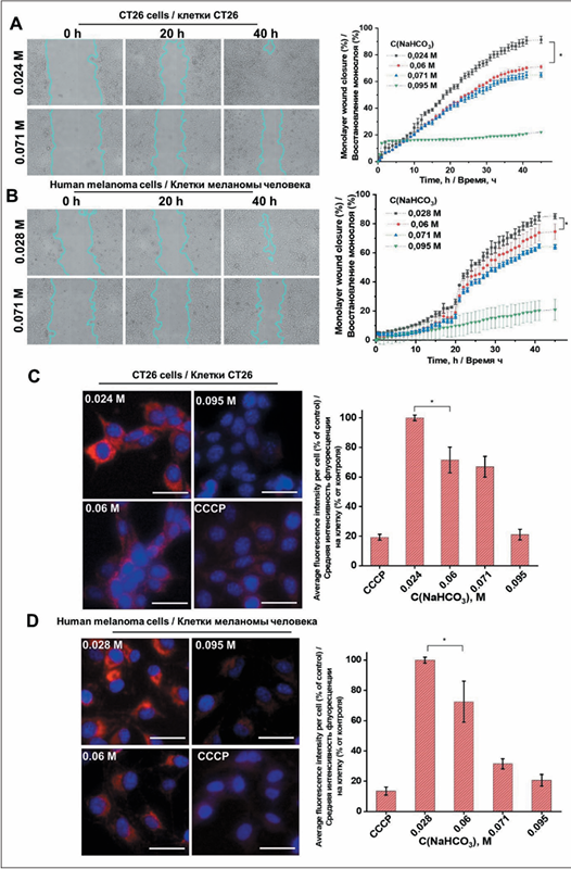 3. Рис. 3. Анализ восстановления монослоя и поляризации митохондрий в клетках CT26 и меланомы, обработанных гидрокарбо натом натрия. Результаты анализа восстановления монослоя, демонстрирующие миграционную способность клеток CT26 (A) и меланомы (B) после 48-часовой инкубации с гидрокарбонатом натрия в концентрациях от 0,024 до 0,119 М. Интенсивность флуоресценции окрашивания MitoRed CMXRos в клетках CT26 (C) и меланомы (D) после 4-часового воздействия гидрокарбоната натрия (0,024–0,095 М). Митохондрии показаны красным цветом, ядра клеток, окрашенные Hoechst 33342, – синим. Карбонилцианид м-хлорфенилгидразон (CCCP) использовался в качестве положительного контроля деполяризации митохондриальной мембраны. Примечания: масштабная линейка = 50 мкм; данные представлены как среднее значение ± стандартное отклонение; * – различия значимы по сравнению с соответствующей контрольной группой (p<0,01); рисунок выполнен авторами | |