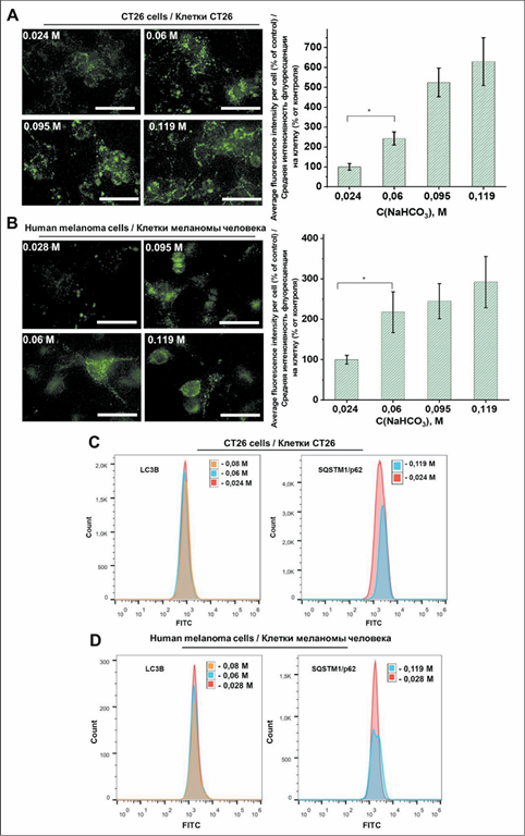 4. Рис. 4. Влияние гидрокарбоната натрия на лизосомальную флуоресценцию и маркеры аутофагии в клетках CT26 и меланомы. Изменения интенсивности флуоресценции LysoGreen в клетках CT26 (A) и меланомы (B) при воздействии возрастающих кон центраций гидрокарбоната натрия (0,024–0,119 М). Проточная цитометрия маркеров аутофагии LC3B и SQSTM1/p62 в клетках CT26 (C) и меланомы (D) после обработки гидрокарбонатом натрия (0,024–0,095 М). Примечания: масштабная линейка = 50 мкм; данные представлены как среднее значение ± стандартное отклонение; * – различия значимы по сравнению с соответствующей контрольной группой (p<0,01); рисунок выполнен авторами | |