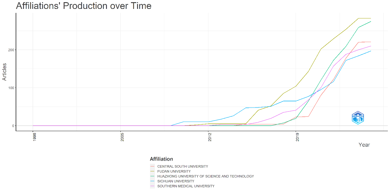 4. Рис. 4. Тенденции публикаций различных учреждений результатов исследований по проблемам рака предстательной железы и биоинформатики. Примечание: рисунок выполнен авторами