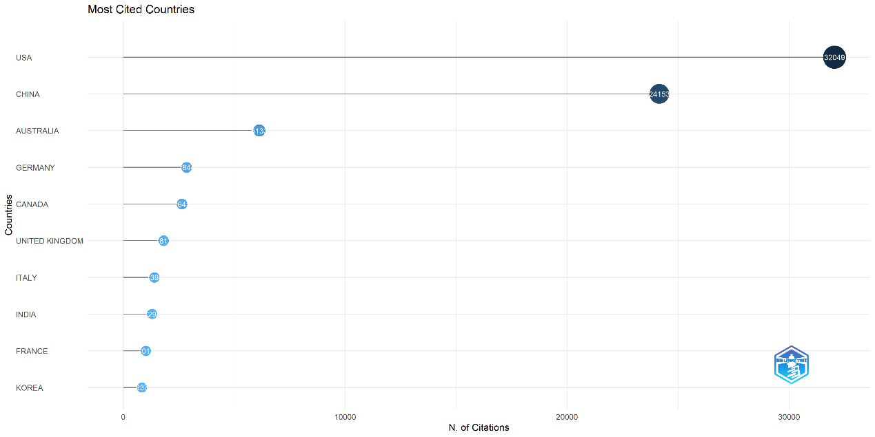 Результаты. Ежегодный высокий темп прироста (18,42 %), средний возраст публикации (5,65 года) и высокий показатель цитируемости (26,34) свидетельствуют о значимом влиянии на научное сообщество. Широко распространены совместные исследования: 13 598 авторов (в среднем 7,21 соавтора на публикацию). Более 21 % исследований проводится в рамках международных партнерств. Форматы публикаций включали журнальные статьи, обзоры и доклады на конференциях. Анализ ключевых слов выявил пять основных тематических кластеров: вычислительные и омиксные методологии; биология опухолей и иммунология; молекулярные механизмы и прогрессирование рака; биомаркеры и регуляция генов; междисциплинарные исследования рака. Анализ публикационной активности показал стабильный объем публикаций до 2013 г., за которым последовал заметный всплеск, достигший пика (около 500 статей) в 2023 г., чему способствовали достижения в области геномики, анализа больших данных и прецизионной онкологии. Анализ цитируемости показал, что ведущие страны по этому признаку – это США и Китай, при этом Китай лидирует по количеству публикаций, в основном за счет собственных исследований, в то время как США демонстрирует более широкое международное сотрудничество. Среди других значимых участников – Австралия, Германия, Канада, а также ряд европейских и азиатских стран.