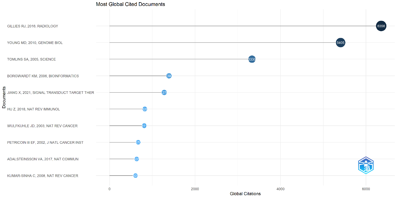 6. Рис. 6. Наиболее цитируемые мировые публикации, посвященные исследованиям рака предстательной железы и биоинформатике. Примечание: рисунок выполнен авторами