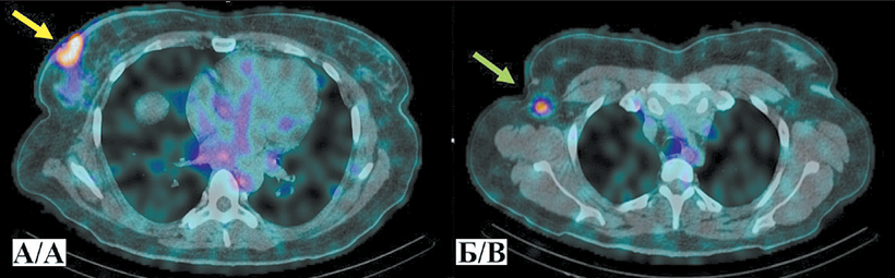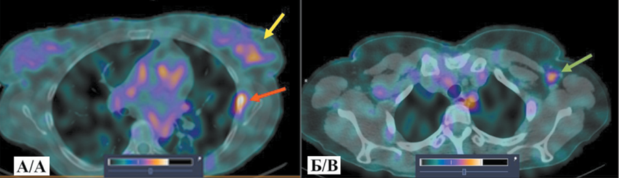 3. Рис. 3. ОФЭКТ/КТ органов грудной клетки больной Д. через 2 ч после инъекции [99mTc]Tc-DB8 в дозировке протеина 80 мкг: А – желтая стрелка указывает на первичную опухоль; Б – зеленая стрелка указывает на метастатический аксиллярный лимфоузел. Примечание: рисунок выполнен авторами