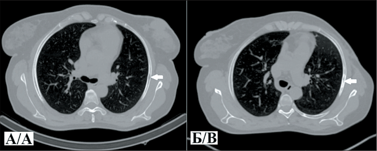 2. Рис. 2. А – компьютерная томография органов грудной клетки в аксиальной проекции (костное окно) больной К. до лечения (белой стрелкой указан участок литической деструкции в V ребре по средней аксиллярной линии справа, размером 19×5 мм); Б – исследование через 11 мес после лечения (белой стрелкой указан участок неравномерных склеротических изменений в V ребре по средней аксиллярной линии справа, размером 26×5 мм). Примечание: рисунок выполнен авторами
