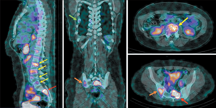 4. Рис. 4. ОФЭКТ/КТ больной Д. через 2 ч после инъекции [99mTc]Tc-DB8 в дозировке протеина 80 мкг. Стрелками отмечены участки гиперфиксации РФЛП в проекции тел LII-LV (желтая стрелка), S1-SII (красная стрелка), подвздошной и седалищной костей справа (оранжевая стрелка), заднего отрезка VII ребра справа (зеленая стрелка). Примечание: рисунок выполнен авторами