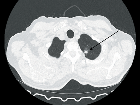 1. Рис. 1. МСКТ органов грудной полости (18.10.22): образо вание S1 левого легкого после 4 циклов терапии по схеме: атезолизумаб + бевацизумаб + карбоплатин + паклитаксел. В S1 легкого – образование с лучистыми тяжистыми контурами, размерами 10×11×8 мм (ранее 7×12×9 мм). Примечание: рисунок выполнен авторами