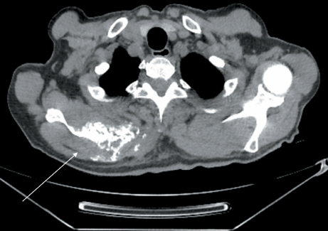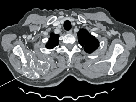 2. Рис. 2. МСКТ органов грудной полости (18.10.22): образование правой лопатки после 4 циклов комбинированной терапии по схеме: атезолизумаб + бевацизумаб + карбоплатин + + паклитаксел. В ости и верхней трети правой лопатки визуализируется объемное мягкотканое образование, размерами 80×57×73 мм (ранее 68×104×68 мм). Примечание: рисунок выполнен авторами